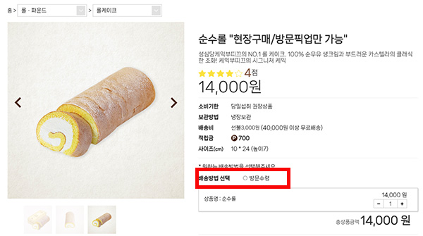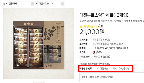 배송방법 선택 부분에 택배가 있으면 택배주문이 가능하고 방문수령이나 대전배송만 있는 경우는 직접 가거나 대전지역에 살아야 주문이 가능합니다.
