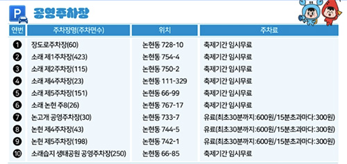 공영주차장은 축제 기간 임시 무료 및 유료 주차장으로 운영됩니다